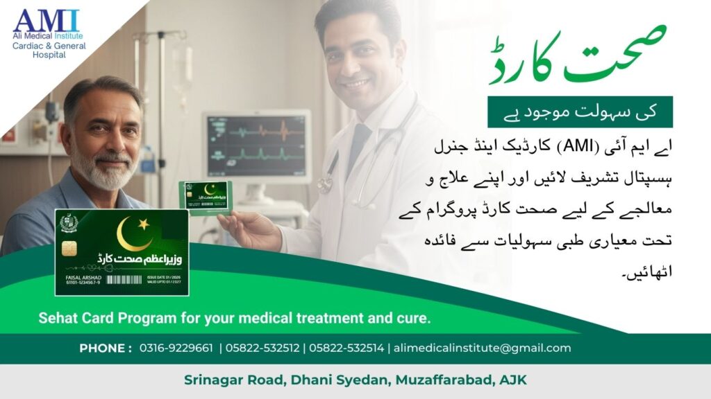 Ali Medical Institute (AMI) is a proud partner in the government’s vital Sehat Card (Sehat Sahulat Program) initiative, dedicated to providing accessible, quality healthcare to the residents of Azad Jammu & Kashmir. Eligible patients are warmly welcomed to receive free medical treatment and care across our range of specialized services, in accordance with the program’s approved standards and facilities. Our commitment through this program is to ensure that essential medical services—including a wide range of inpatient procedures, surgeries, and emergency care—are within reach without financial hardship. Patients can use their valid Sehat Card or CNIC to access this facility at our hospital.